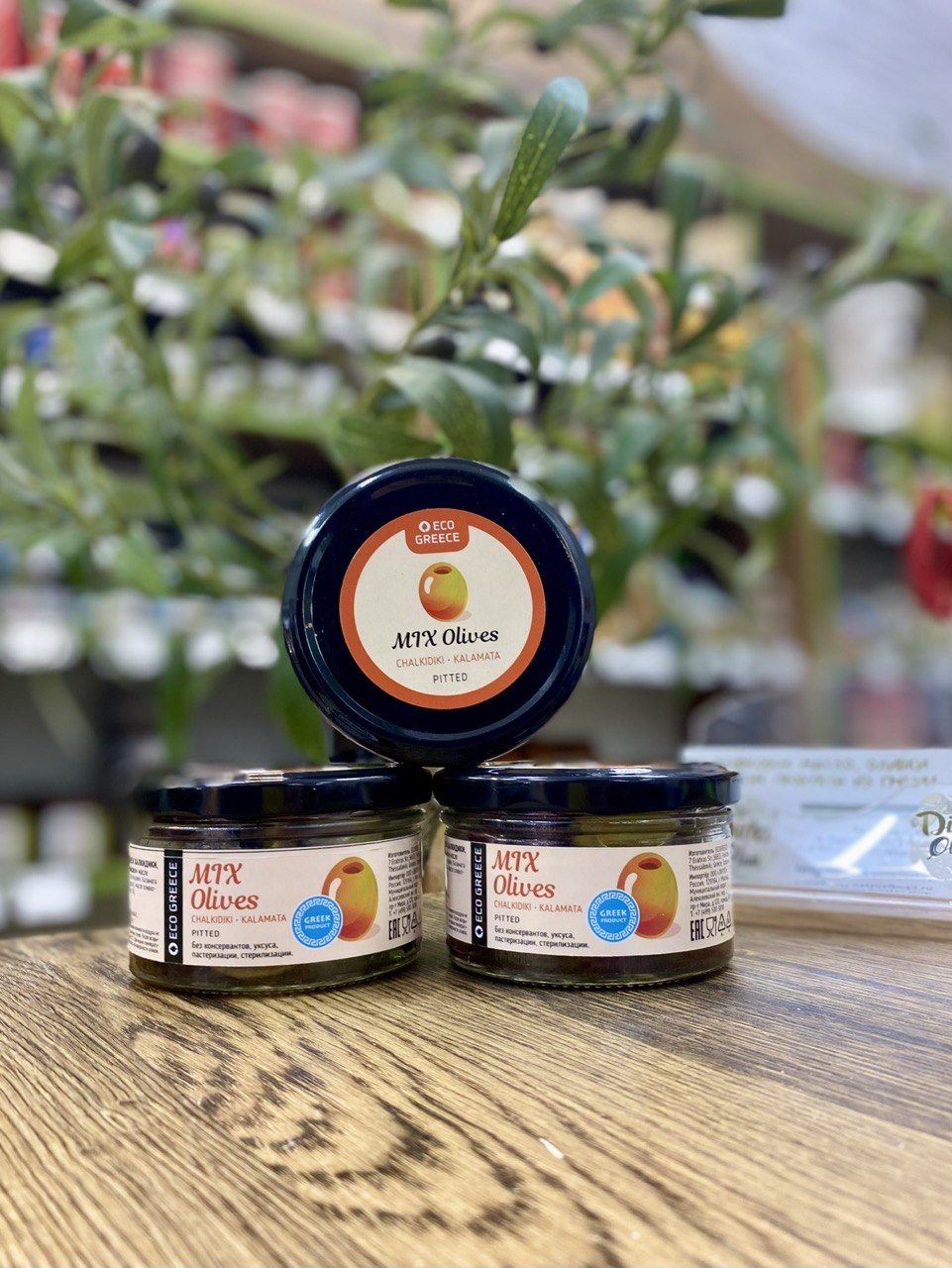 Микс оливок Халкидики и Каламата в вакуумной упаковке в натуральном рассоле 250гр